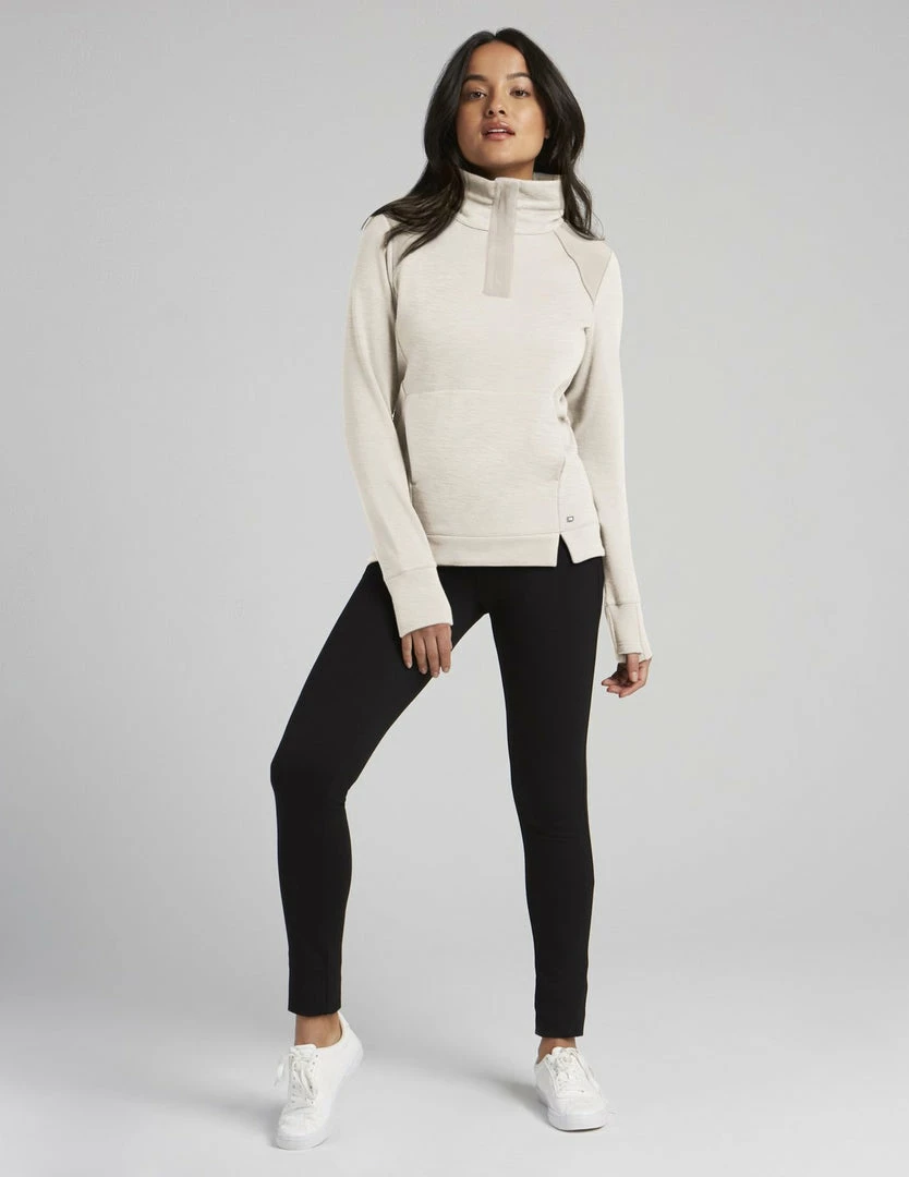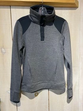 Soft stand-up collar sweater made with Flex fleece, which is made with recycled polyester, created by using post-consumer plastic bottles. Top with front placket with snap buttons, slits at front, back collar adjustment, thumbhole at cuff, shoulder cuts, and hi-low hemline.Stretch, soft and easy care fabric.