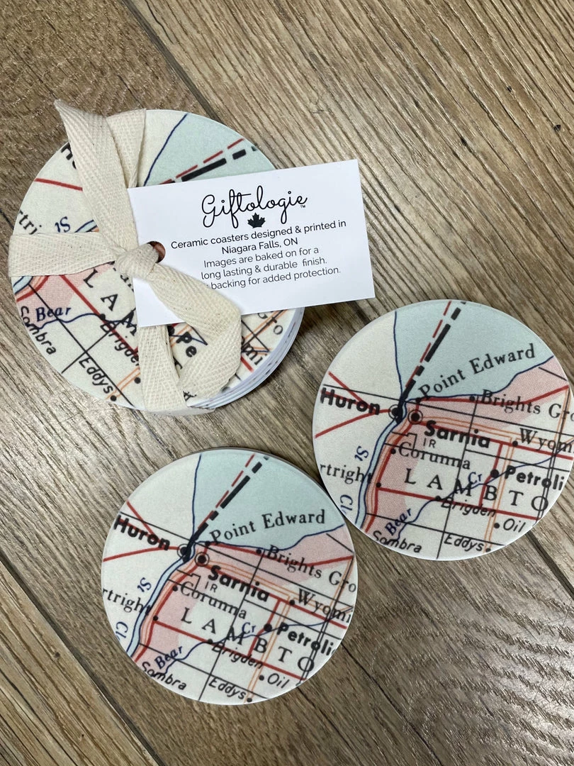 Enjoy these ceramic coasters yourself or great as a gift for locals or friends that have moved away. The vintage map is of the Sarnia Lambton Area and has been baked on for a long lasting and durable finish,. The cork backing has added protection.