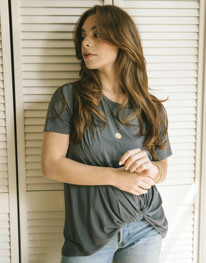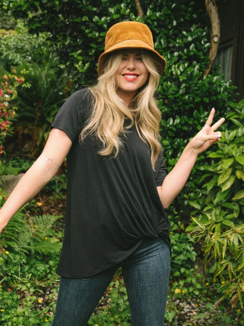 Anything but basic, the Knotty Tee is one of our most unique and flattering tees. The knot sits at the waist and does the styling work for you. The widened neckline, long length and relaxed fit make this piece a go-to for all shapes and sizes.