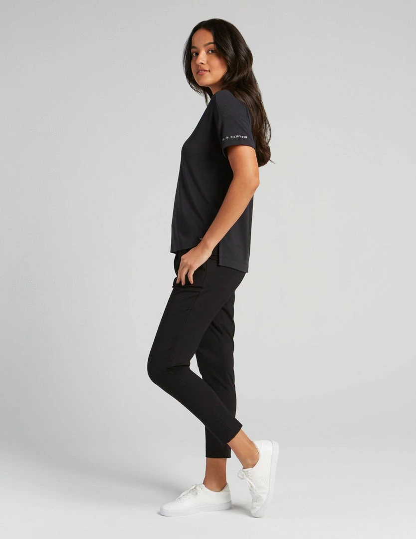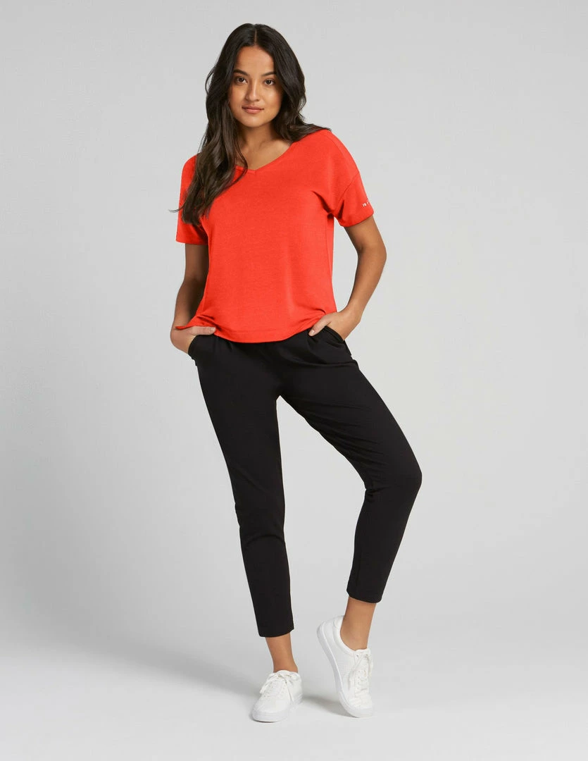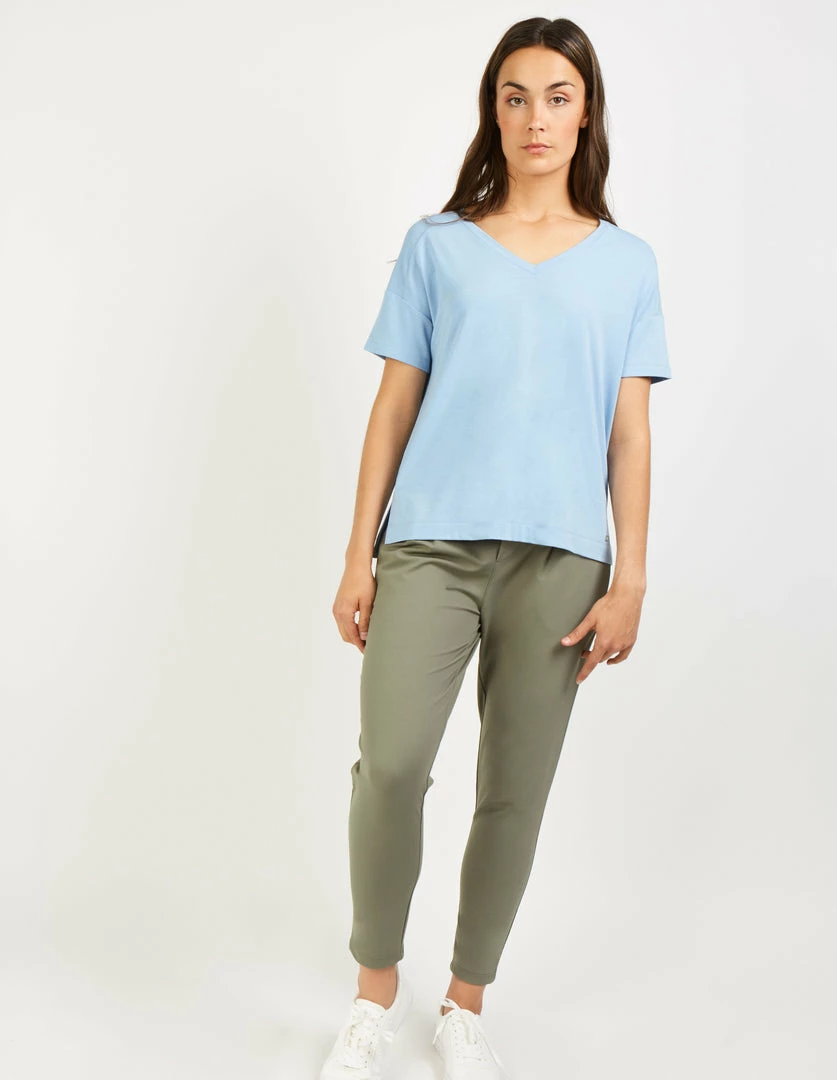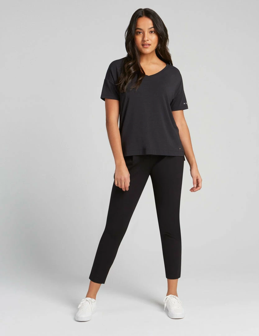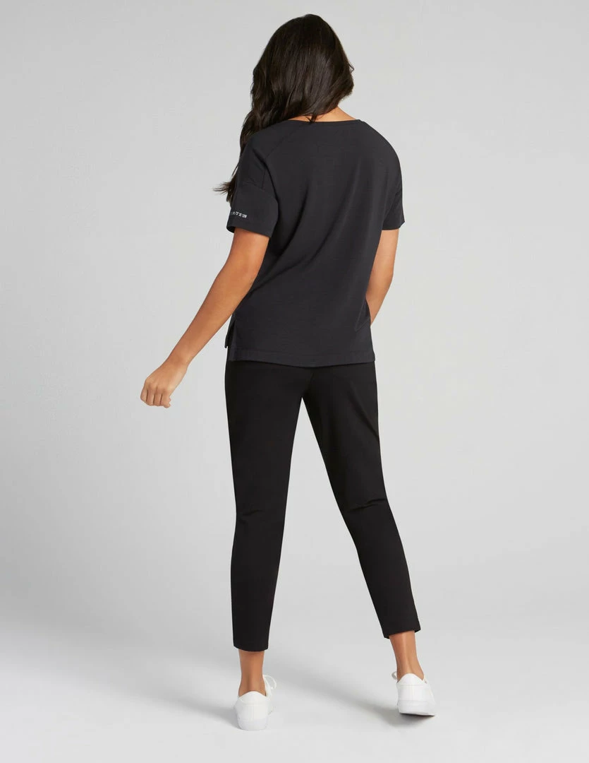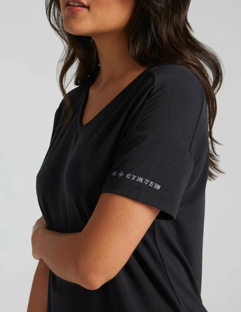 This soft and stretchy V-neck boxy top is made with TENCEL™ Modal, sourced from sustainable beechwood, and produced with an environmentally responsible pulp to fiber process. It features kimono sleeves, hi-low hemlines with side slits, and FIG screen print on the left sleeve. It also contains a silky soft stretch fabric that controls moisture and that offers UPF 50+ solar protection.