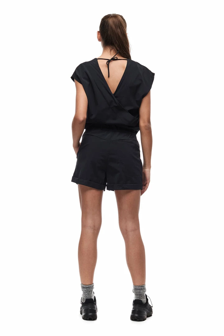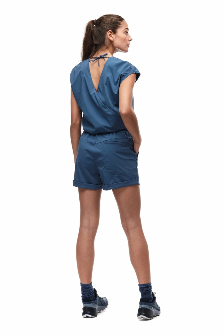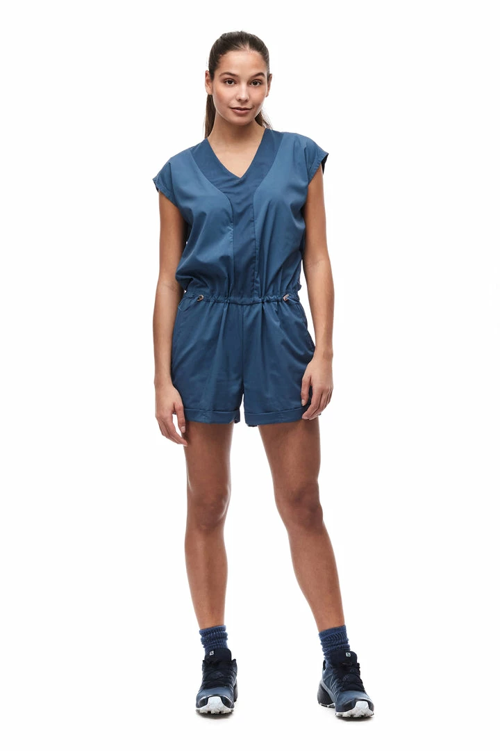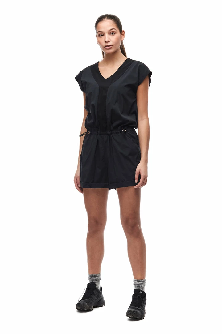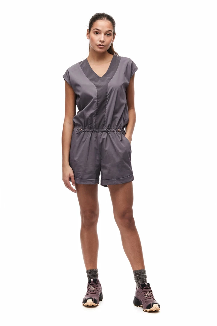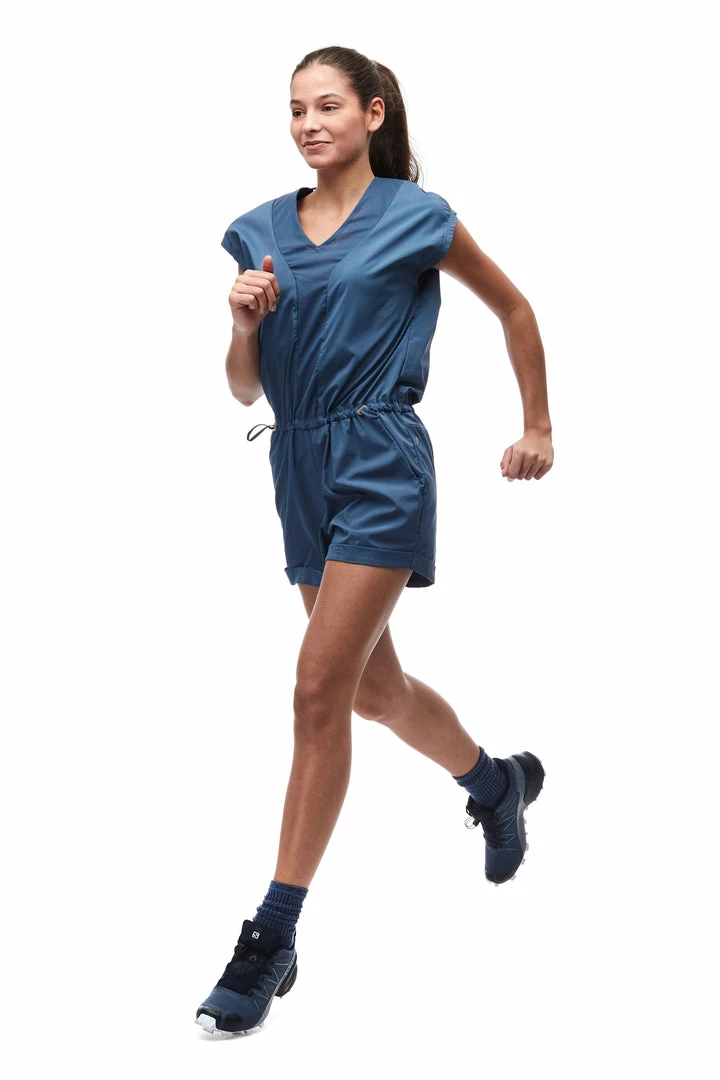 The Indyeva ESI romper is made of woven stretch fabric that is light and strong. The weave is a 2-way stretch fabric that gives ease of movement, dries quickly, wicks moisture, and has a UPF rating of 50+. These features make this romper versatile, great for travel and various outdoor activities.
