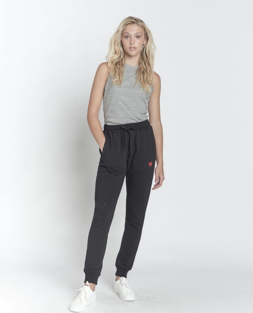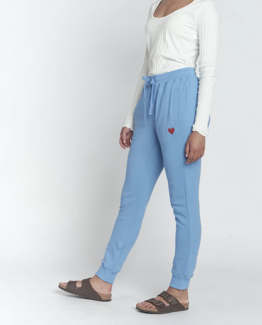 Tapered joggers with cuff at the bottom, with elastic waistband and functional drawstring. Wear them high-waisted for a refined look or at the hips for a more casual fit. Made with 100% cotton and features our upcycled heart appliqué.