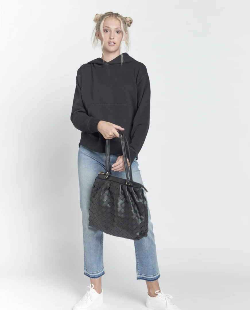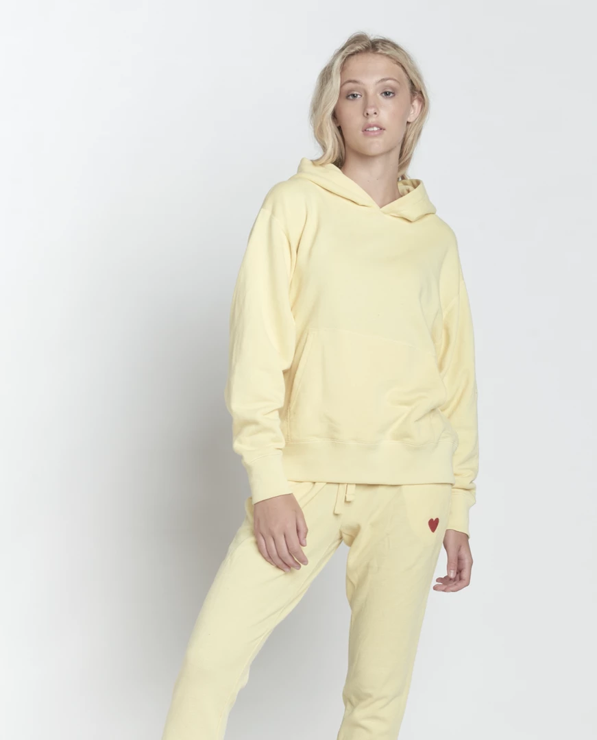 Structured classic hoodie sweatshirt featuring front pockets. Perfect for all ages with a flattering fit. Made with 100% cotton and features our upcycled heart appliqué.