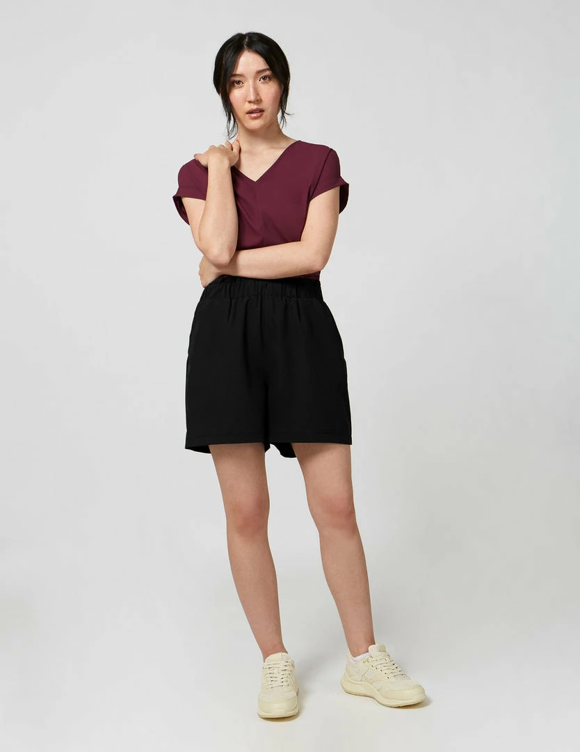 Short with pull-on waistband made with Möbius, which is made with recycled polyester, created by using post-consumer plastic bottles. Mid-rise elasticized waist short with front slant pockets and fake welt pocket at back.