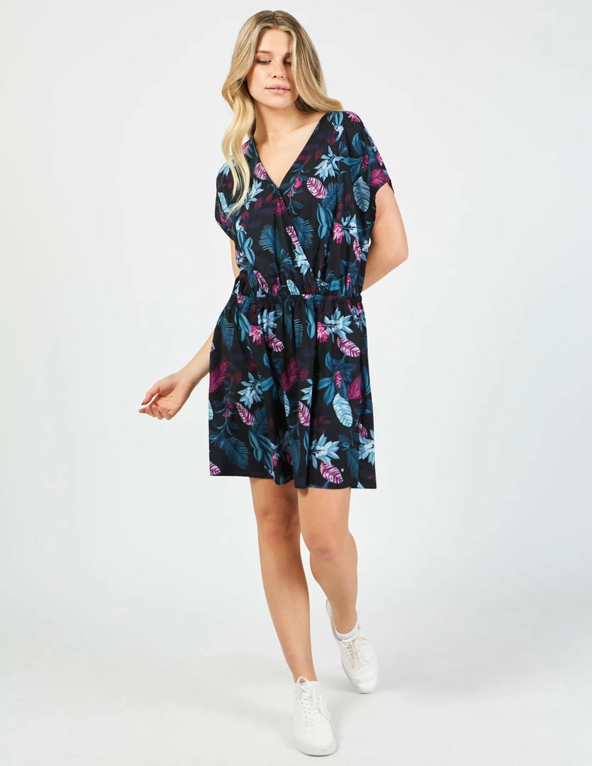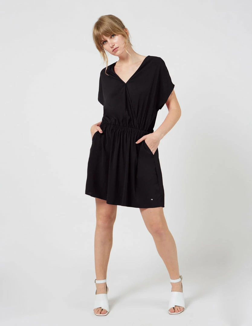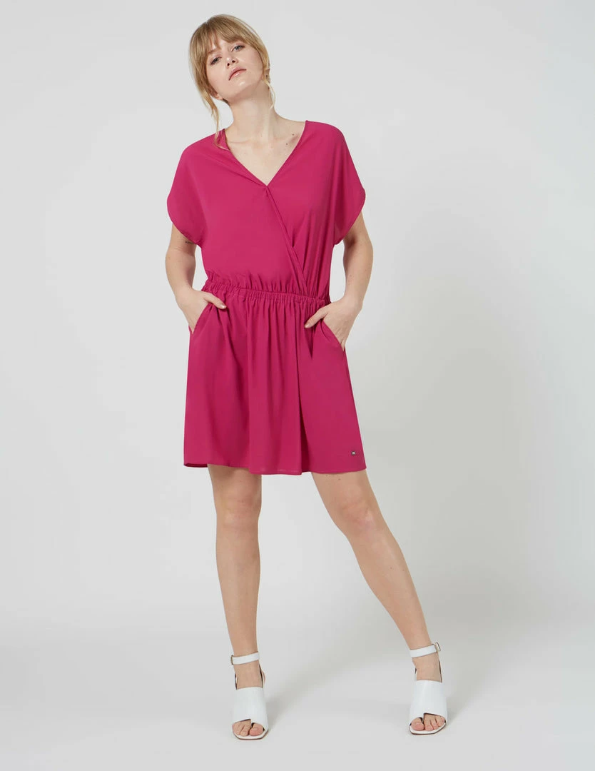 Dress with crossover neckline made with Möbius LT, which is made with recycled polyester, created by using post-consumer plastic bottles. Above the knee length dress with dolman sleeves and slant pockets.