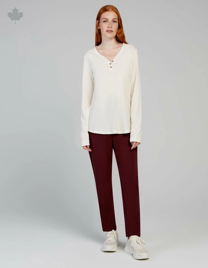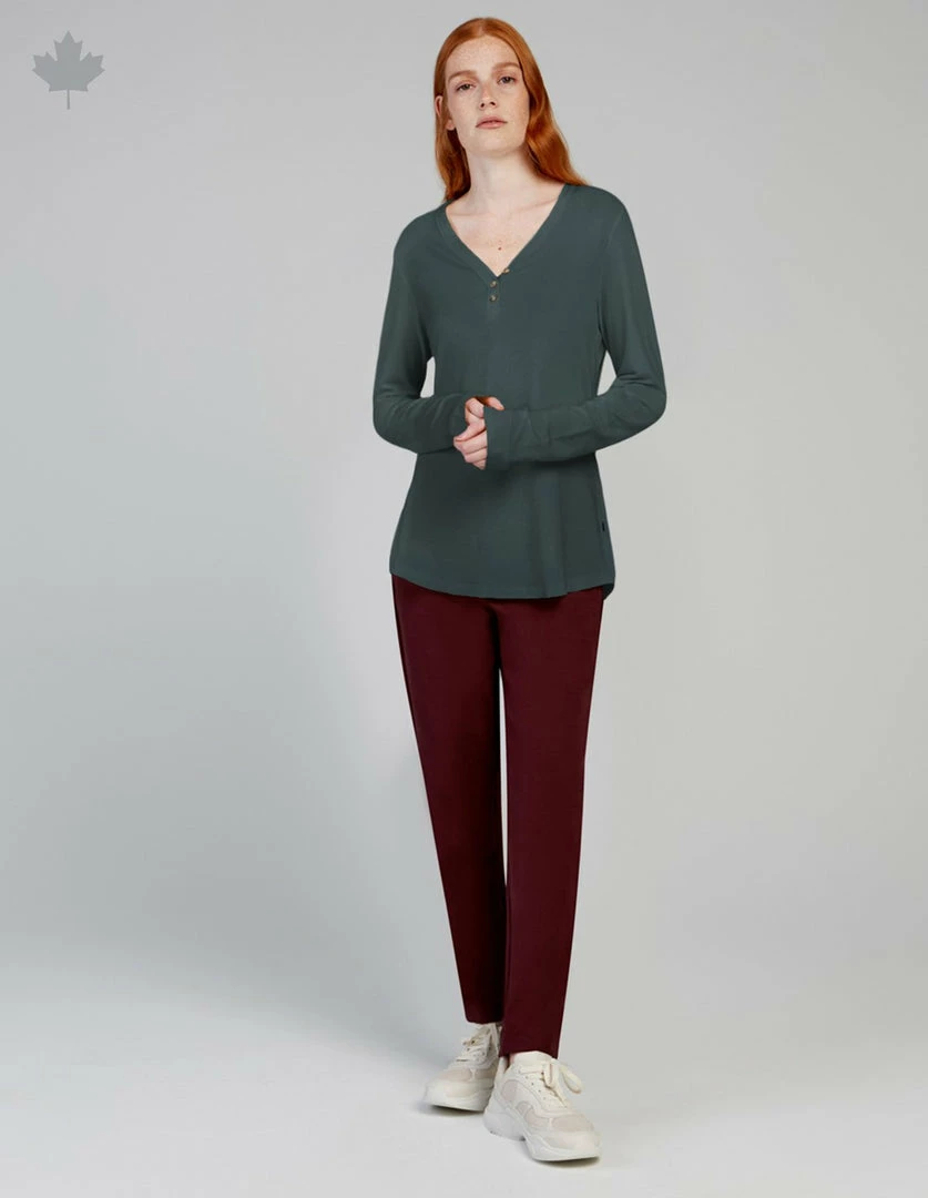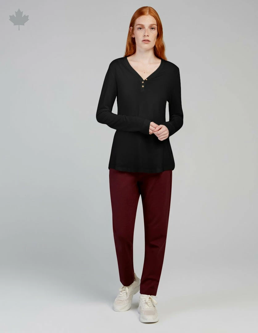 Silky soft henley collar top made with organic cotton and TENCEL™ Lyocell, created using an environmentally responsible closed loop process, which transforms wood pulp into fibers. Top with front and back curved hems, and buttonholes with tortoise buttons.