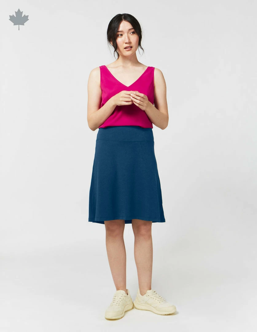 A-line knee length skirt made with organic cotton and TENCEL™ Lyocell, created using an environmentally responsible closed loop process, which transforms wood pulp into fibers. Mid-rise skirt with turn up waistband.